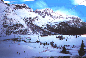 Es dämmert über dem Avisio. Die Lifte haben ihren Betrieb eingestellt. Es heißt Abschied nehmen. In der Ferne erglüht der „Cimon di Lagorai“ im Abendrot. Ein weißer Traum geht zu Ende. -uwa- 1998