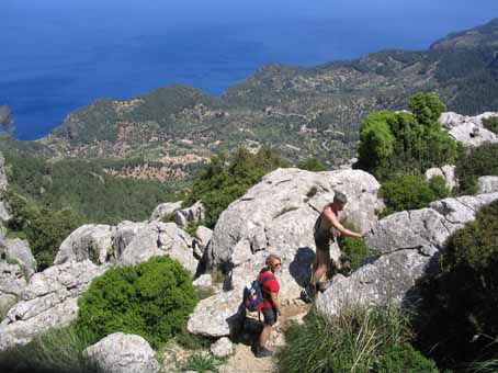 Immer häufiger schaut der Galatzo, mit 1026 Metern höchster Berg im Südwesten der Balearen-Insel, jetzt durch das lichter werdende Dach von Steineichen auf die Wanderer hinab. Erdbeerbäume säumen eine Zeit lang den längst zur schmalen Fußspur verengten Weg bergan. Was ihre Strauchhöhe an Erntefreundlichkeit verspricht, verdirbt leider der gewöhnungsbedürftige Geschmack ihrer Früchte. Ein frischer Wind weht auf dem schmalen Bergsattel, der in 900 Metern Höhe erste Anforderungen an die persönliche Schwindelfreiheit stellt. Doch die ungetrübte Fernsicht ist die Mühe wert. Um wieviel größer mag das Gefühl von Freiheit und Unbeschwertheit erst auf dem Gipfel des Galatzo sein?