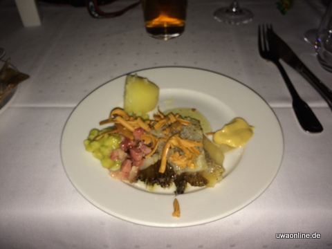 „Laugenfisch“ mit Erbsenpüree, Kartoffeln,